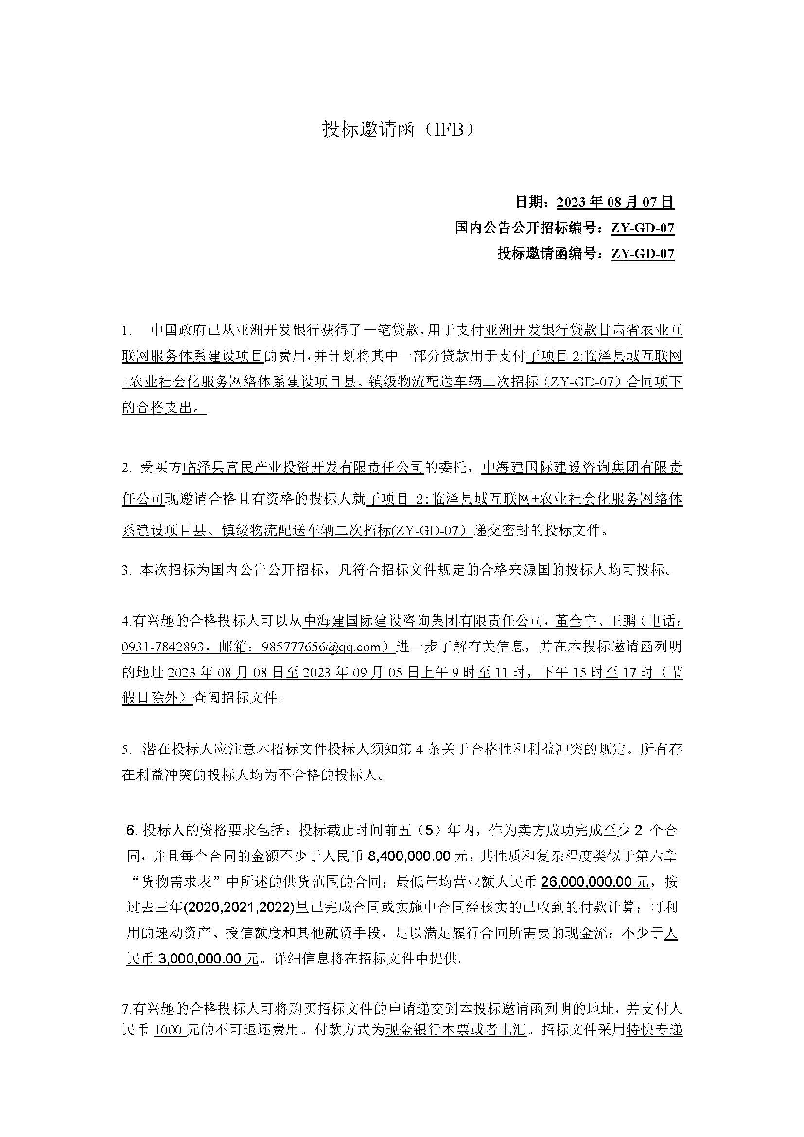 亚洲开发银行贷款甘肃省农业互联网服务体系建设项目子项目2:临泽县域互联网+农业社会化服务网络体系建设项目县、镇级物流配送车辆二次招标投标邀请函