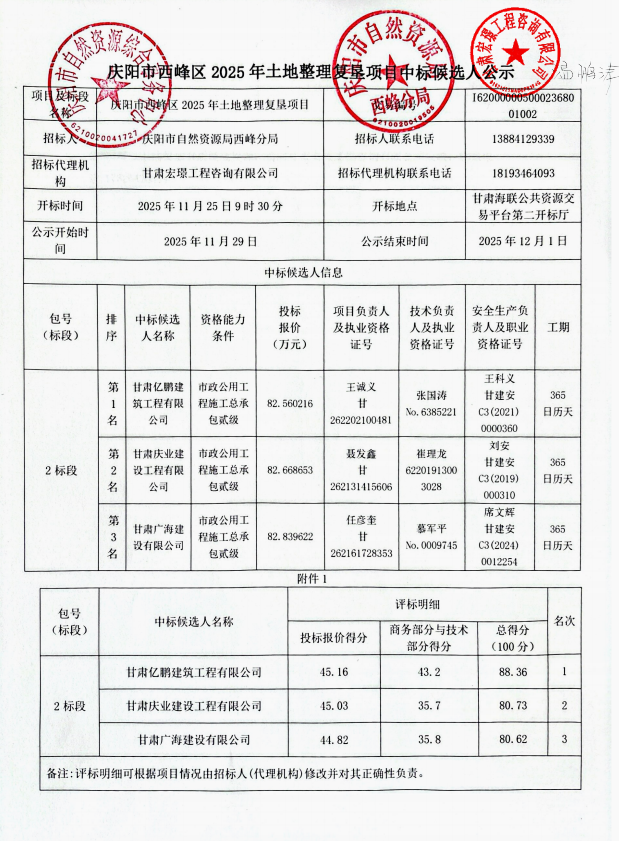 庆阳市西峰区2025年土地整理复垦项目(二标段)中标候选人公示