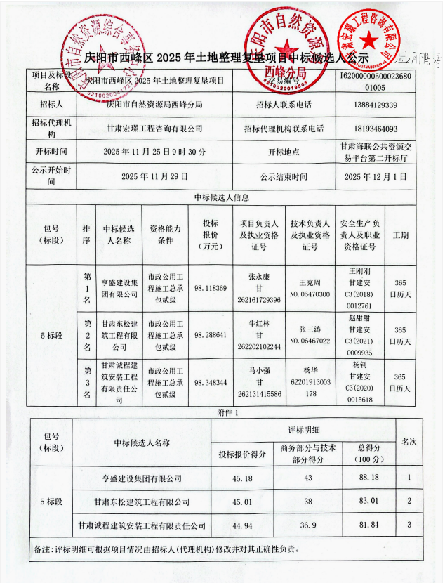 庆阳市西峰区2025年土地整理复垦项目(五标段)中标候选人公示