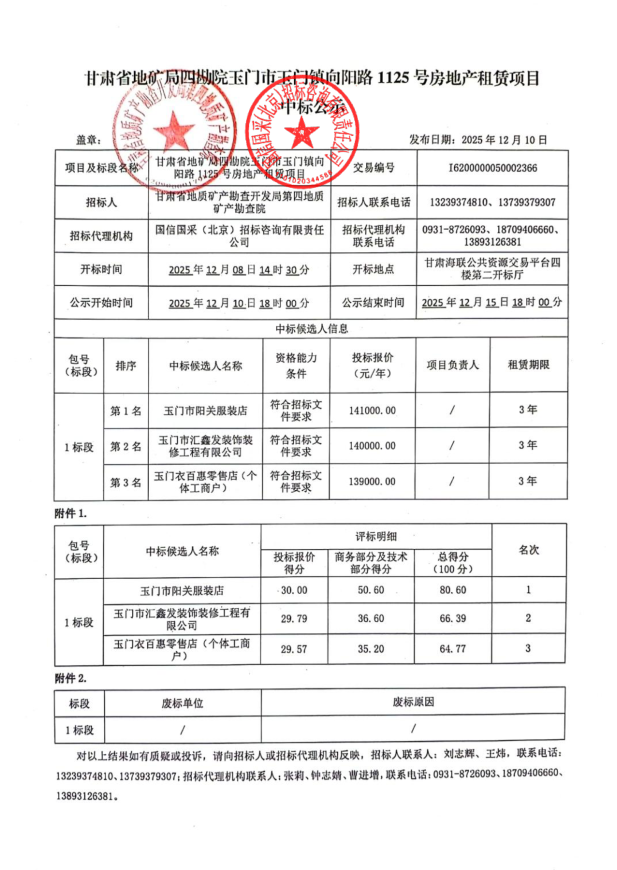 甘肃省地矿局四勘院玉门市玉门镇向阳路1125号房地产租赁项目中标候选人公示