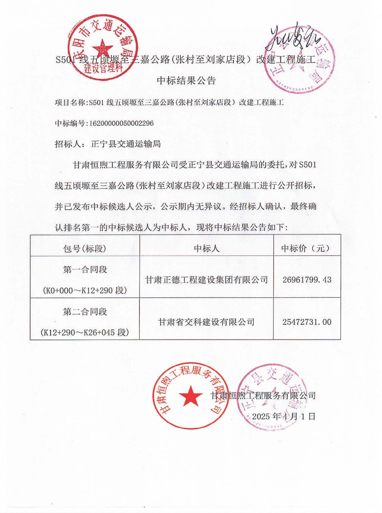 S501线五顷塬至三嘉公路(张村至刘家店段)改建工程施工中标结果公告