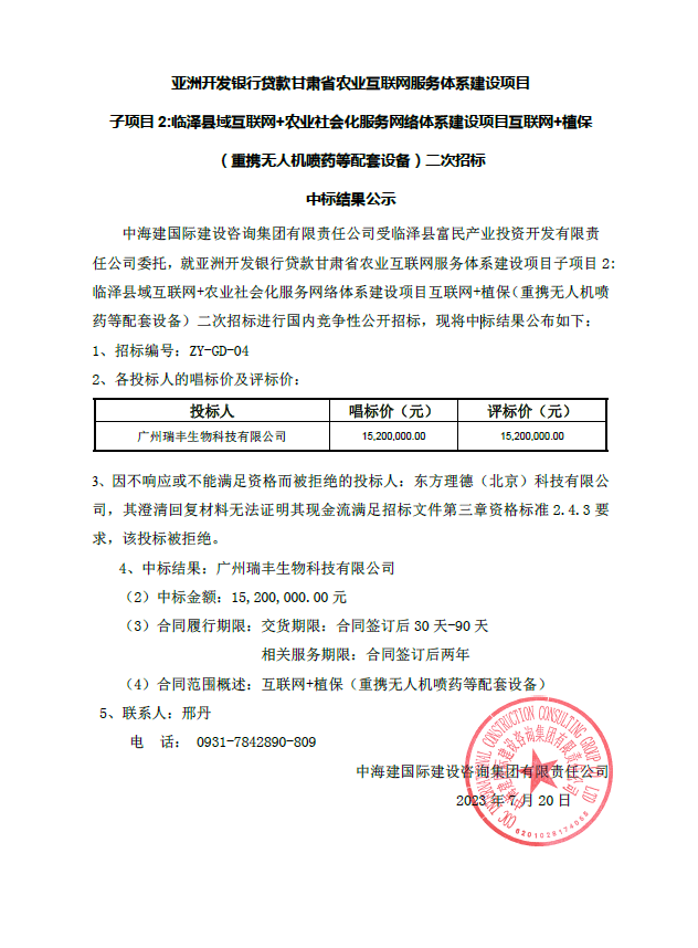 亚洲开发银行贷款甘肃省农业互联网服务体系建设项目子项目2:临泽县域互联网+农业社会化服务网络体系建设项目互联网+植保(重携无人机喷药等配套设备)二次招标中标结果公示