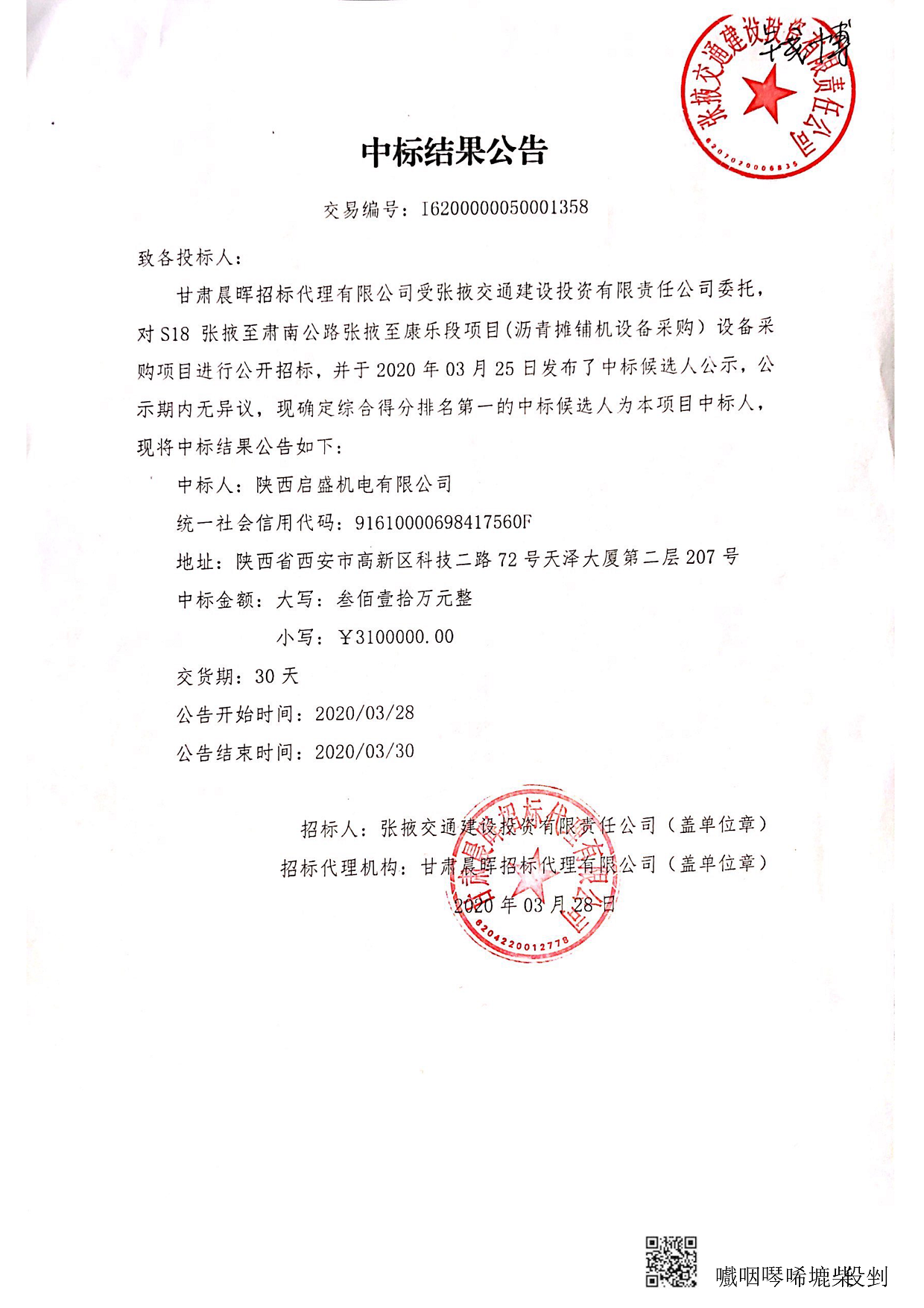 S18张掖至肃南公路张掖至康乐段项目(沥青摊铺机设备采购)设备采购项目中标结果公告