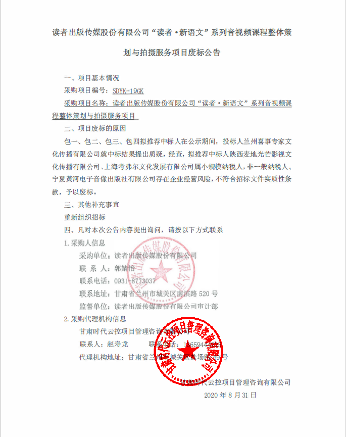 读者出版传媒股份有限公司“读者·新语文”系列音视频课程整体策划与拍摄服务项目废标公告