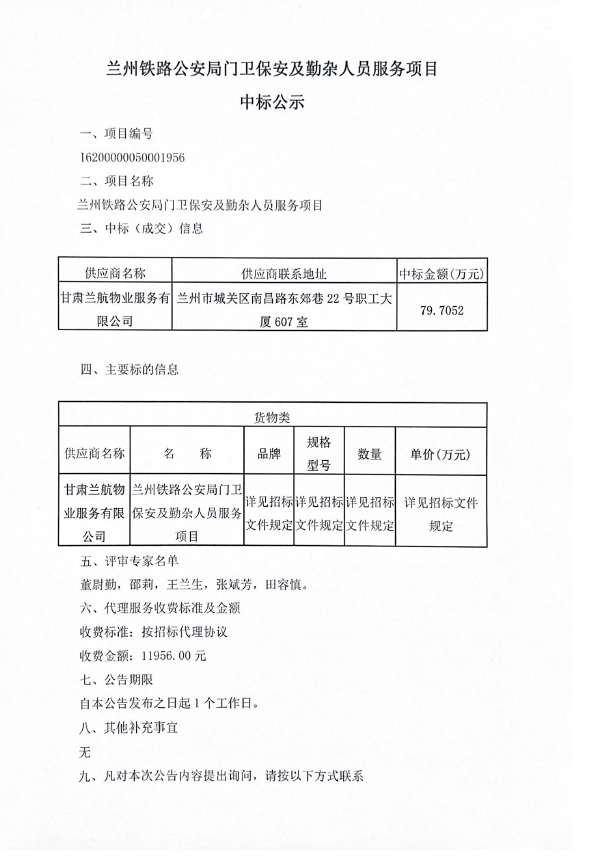 兰州铁路公安局门卫保安及勤杂人员服务项目中标公示