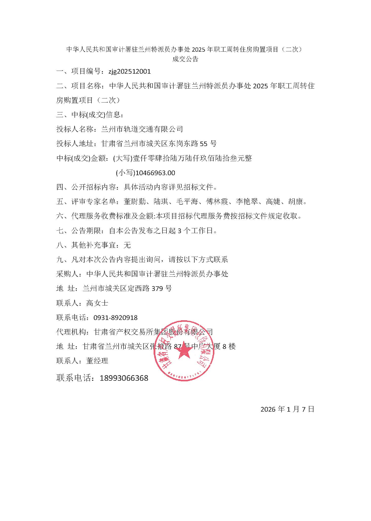 中华人民共和国审计署驻兰州特派员办事处2025年职工周转住房购置项目(二次)中标公示