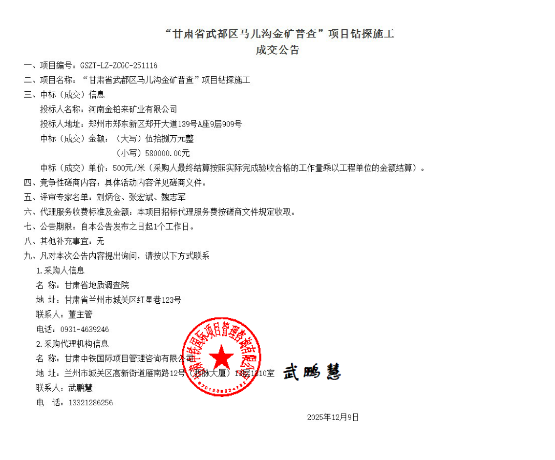 “甘肃省武都区马儿沟金矿普查”项目钻探施工 成交公告