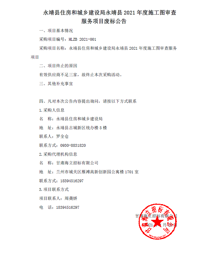 永靖县住房和城乡建设局永靖县2021 年度施工图审查服务项目废标公告