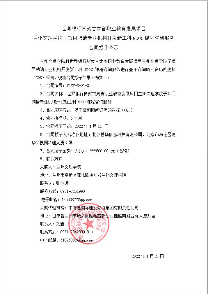 世界银行贷款甘肃省职业教育发展项目兰州文理学院子项目聘请专业机构开发新工科MOOC课程咨询服务合同授予公示