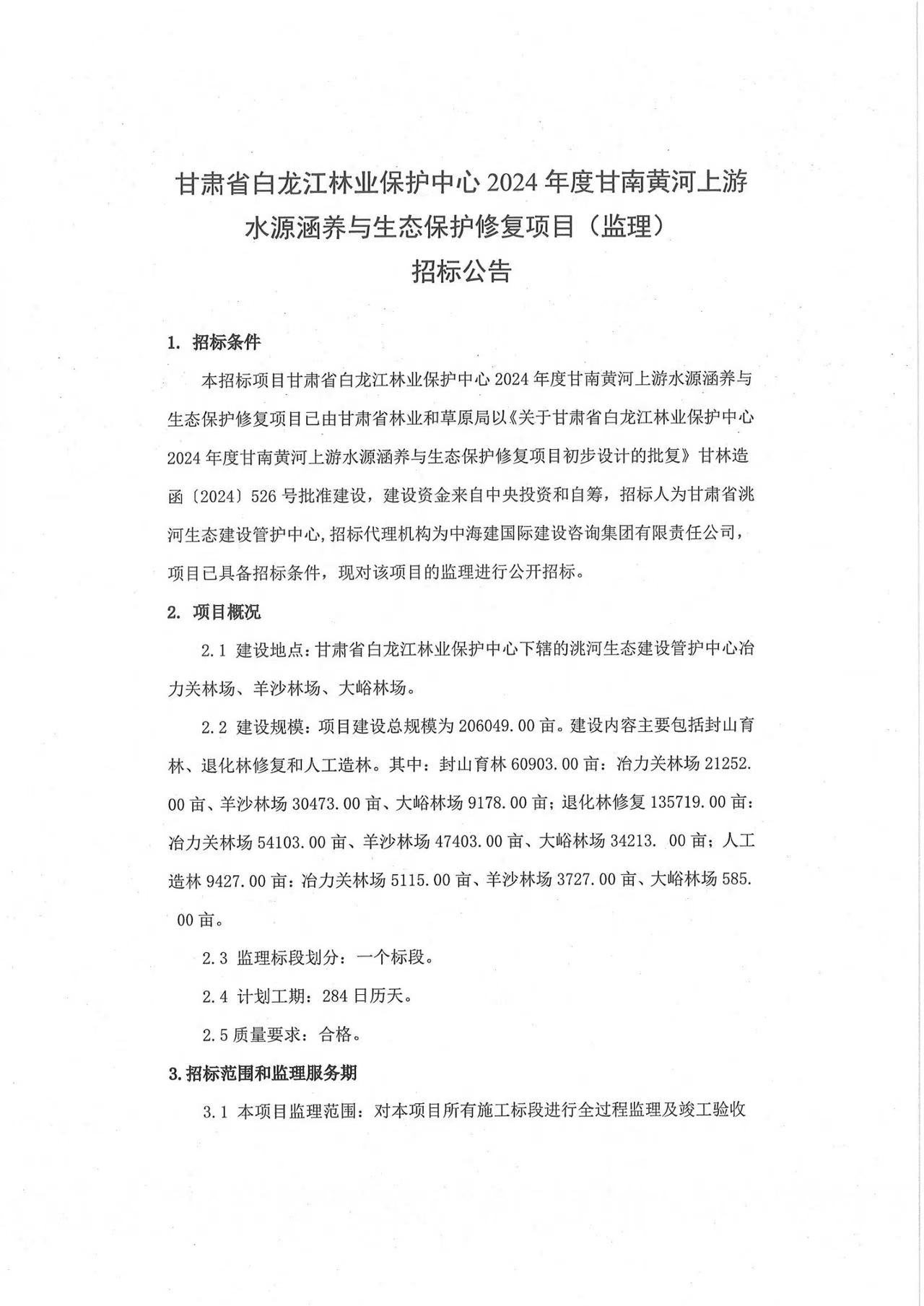 甘肃省白龙江林业保护中心2024年度甘南黄河上游水源涵养与生态保护修复项目(监理)招标公告