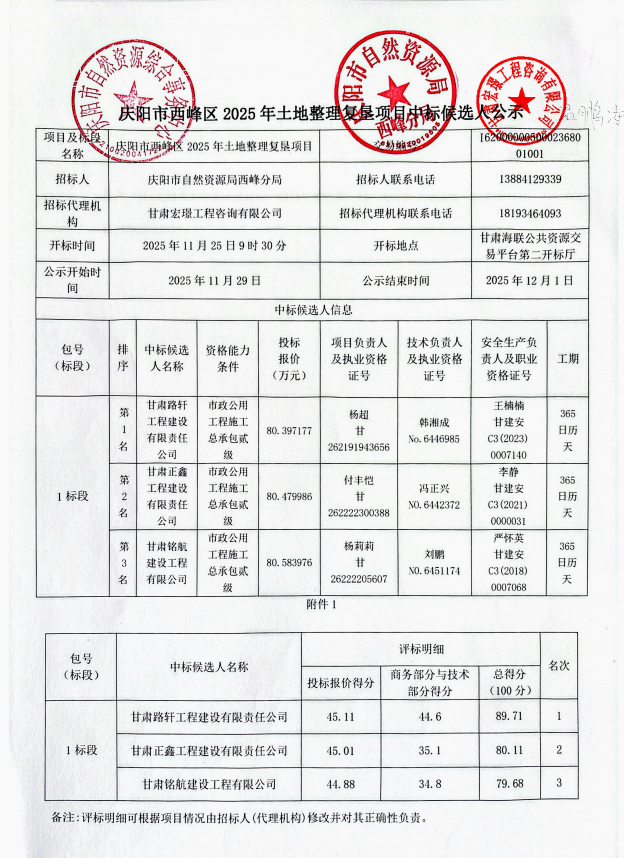庆阳市西峰区2025年土地整理复垦项目(一标段)中标候选人公示