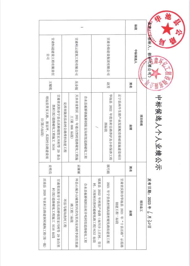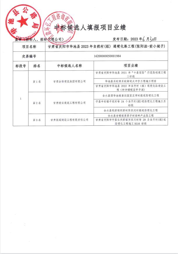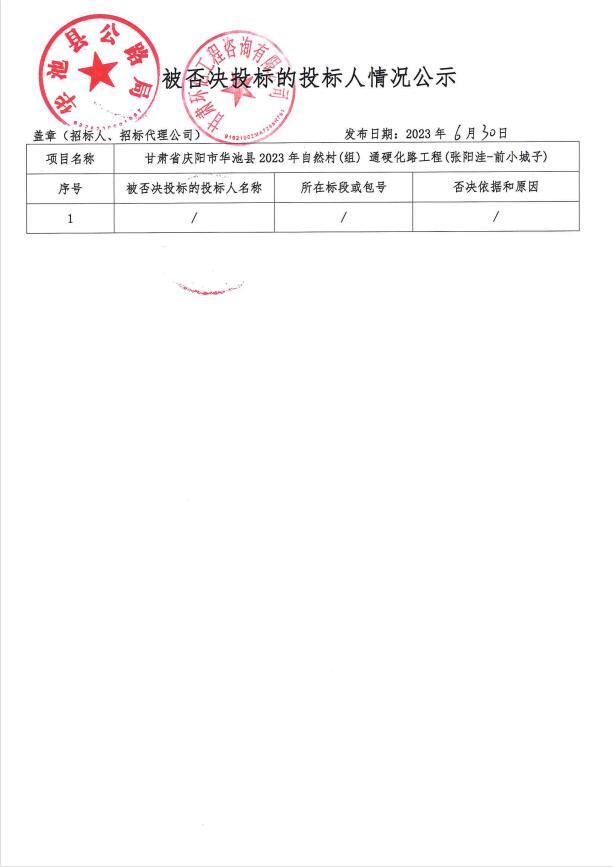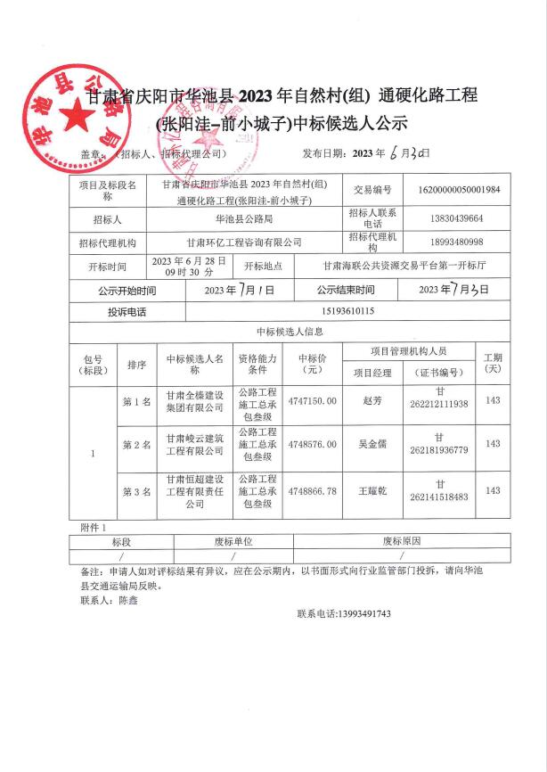 甘肃省庆阳市华池县2023年自然村(组)通硬化路工程(张阳洼-前小城子)中标公示