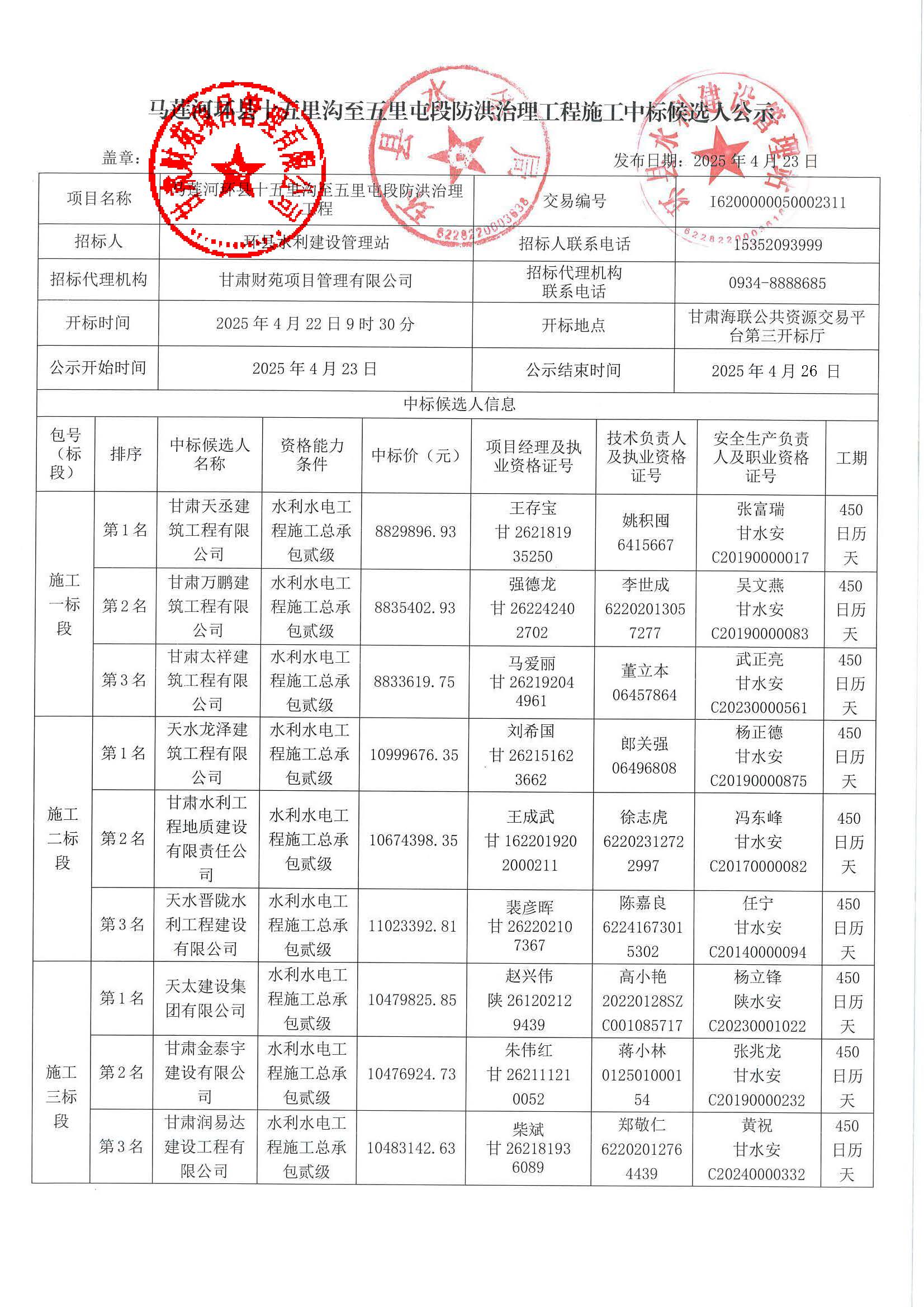 马莲河环县十五里沟至五里屯段防洪治理工程施工中标候选人公示
