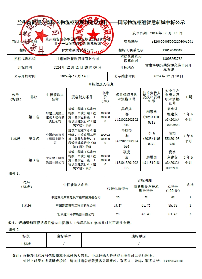 兰州商贸服务型国家物流枢纽规划建设项目——国际物流枢纽智慧新城中标公示