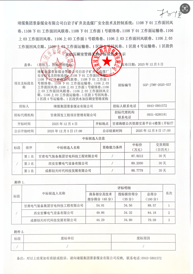 靖煤集团景泰煤业有限公司白岩子矿井及选煤厂安全技术及控制系统:1108下01工作面回风巷、1108下01工作面回风联巷、1108下01工作面1号联络巷、1108下01工作面运输巷、1106上03工作面中标候选人公示