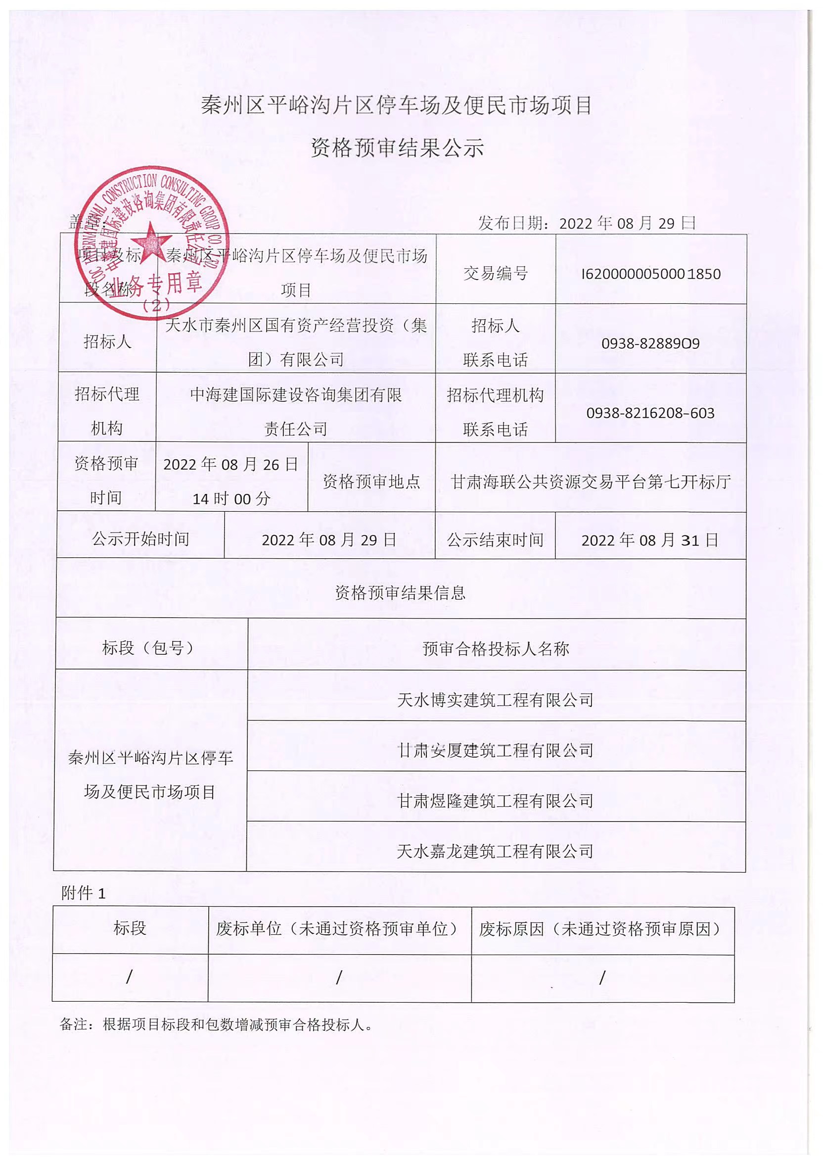 秦州区平峪沟片区停车场及便民市场项目资格预审结果公示