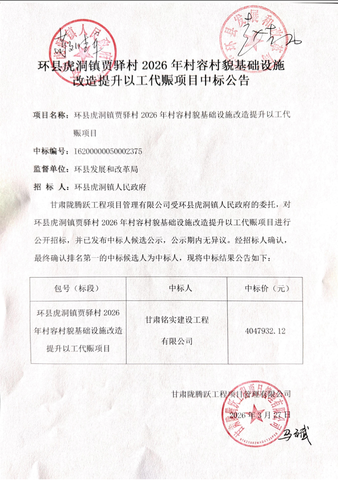 环县虎洞镇贾驿村2026年村容村貌基础设施改造提升以工代赈项目中标结果公告