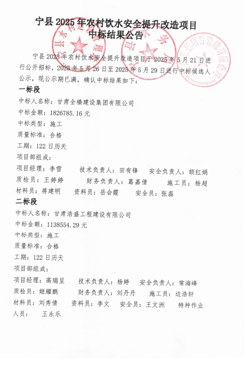 宁县2025年农村饮水安全提升改造项目中标结果公告