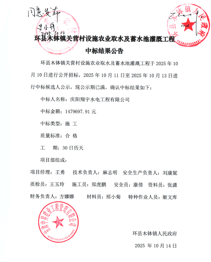 环县木钵镇关营村设施农业取水及蓄水池灌溉工程中标结果公告