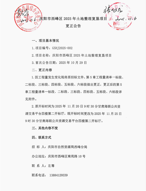 庆阳市西峰区2025年土地整理复垦项目[变更公告]
