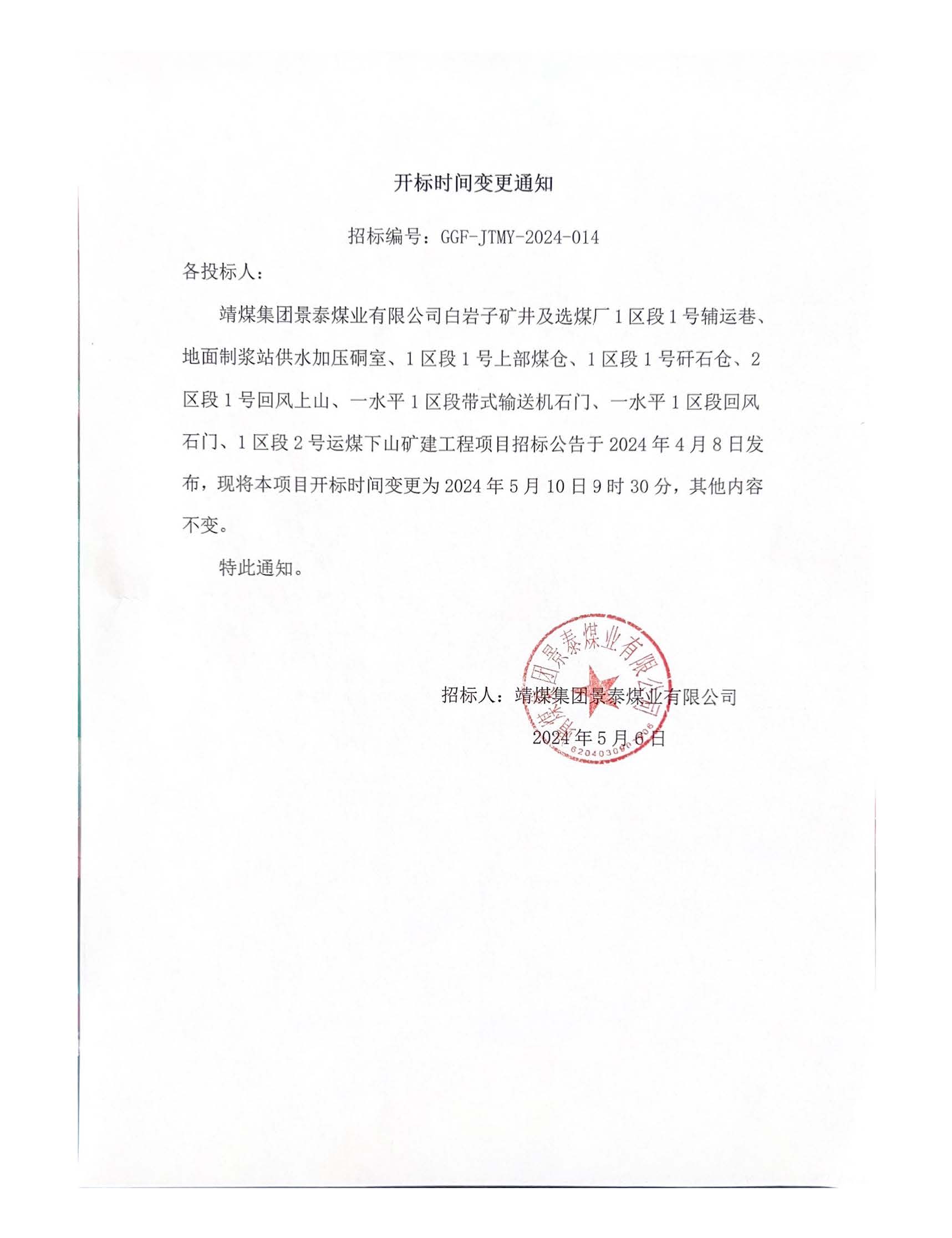 靖煤集团景泰煤业有限公司白岩子矿井及选煤厂1区段1号辅运巷、地面制浆站供水加压硐室、1区段1号上部煤仓、1区段1号矸石仓、2区段1号回风上山、一水平1区段带式输送机石门、一水平1区段回风石门、1区段2号运煤下山矿建工程变更公告