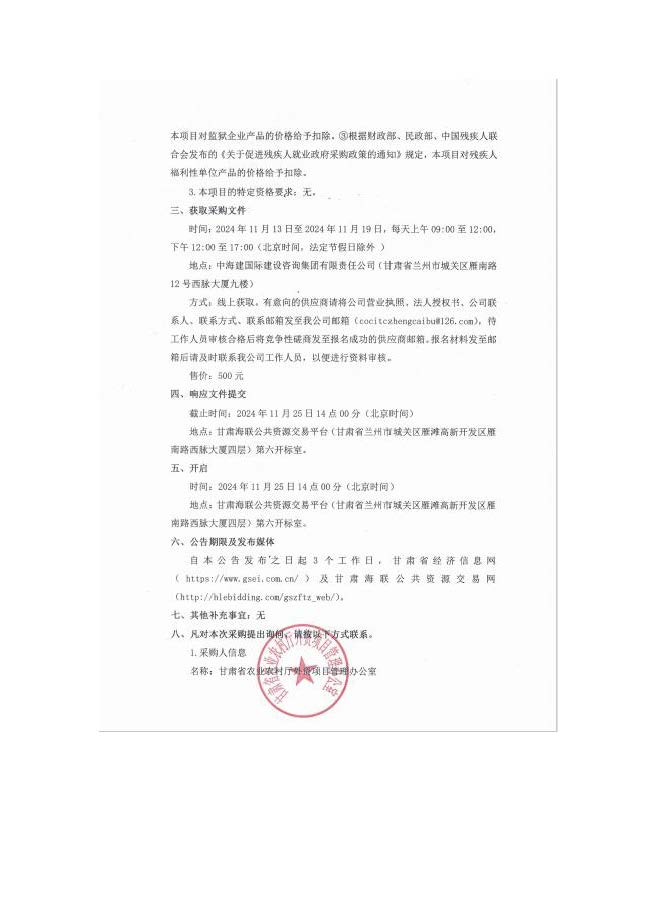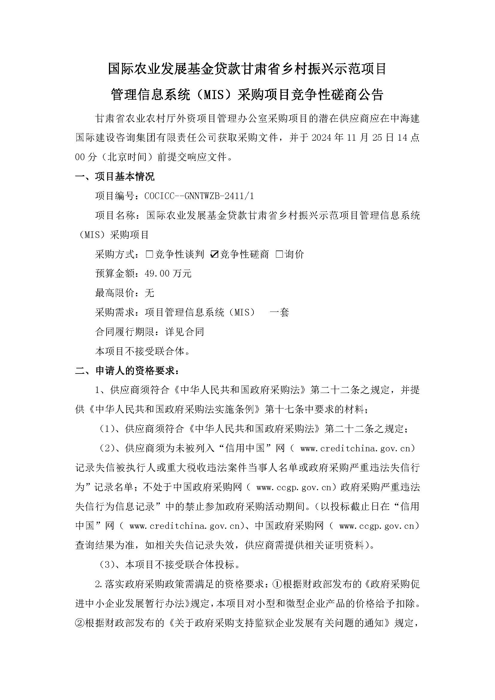 国际农业发展基金贷款甘肃省乡村振兴示范项目管理信息系统(MIS)采购项目竞争性磋商公告