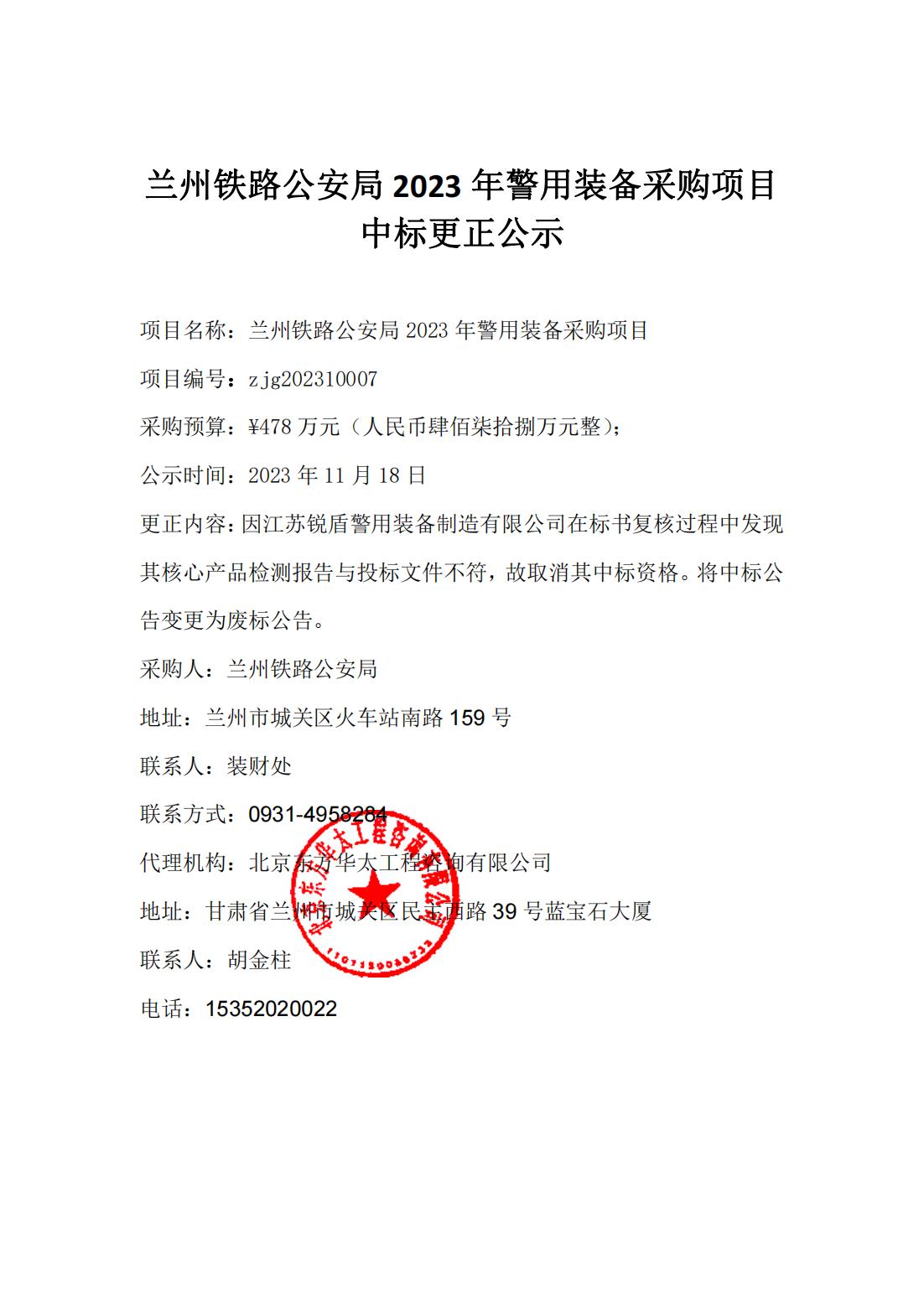 兰州铁路公安局2023年警用装备采购项目变更公告