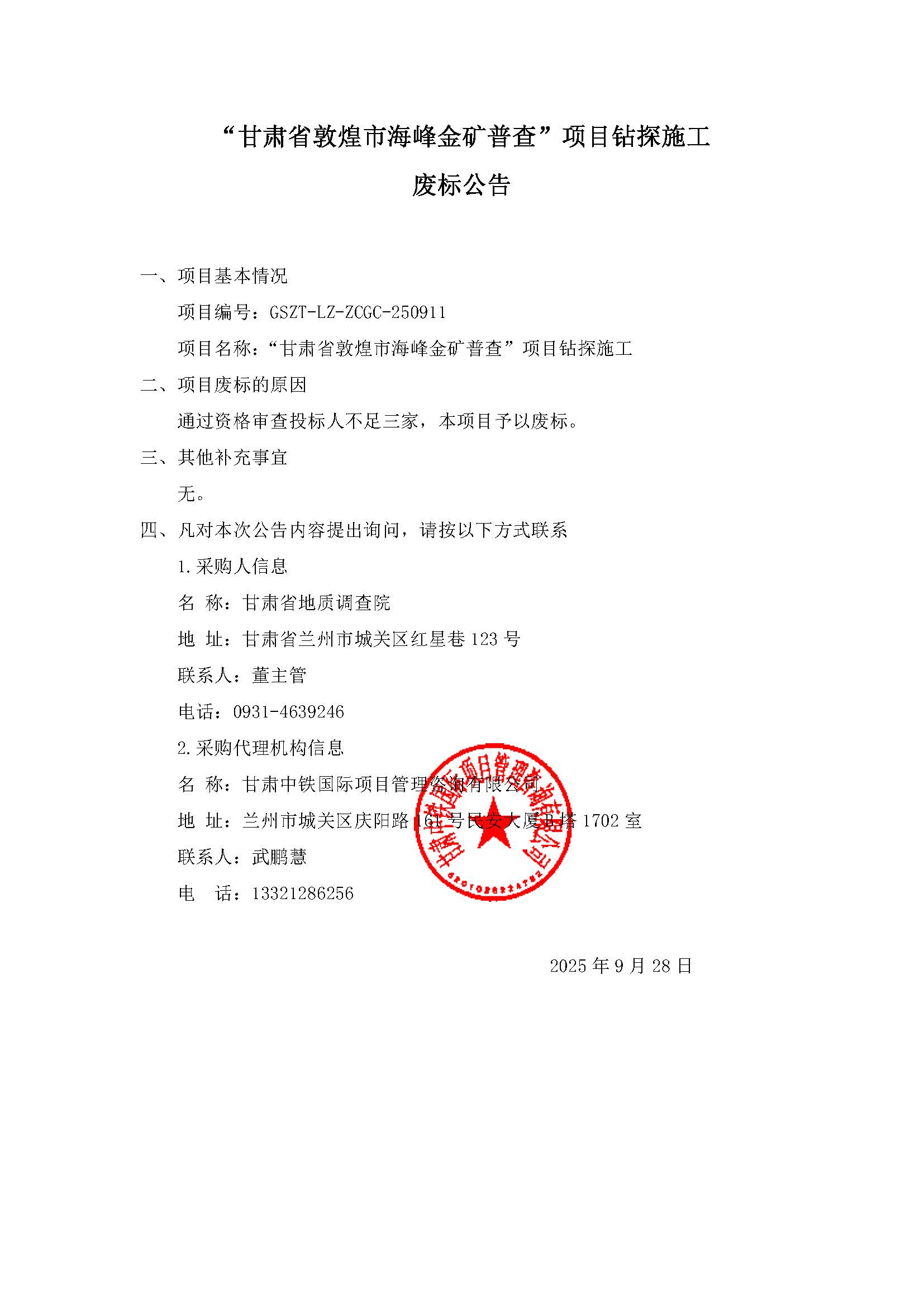 “甘肃省敦煌市海峰金矿普查”项目钻探施工废标公告