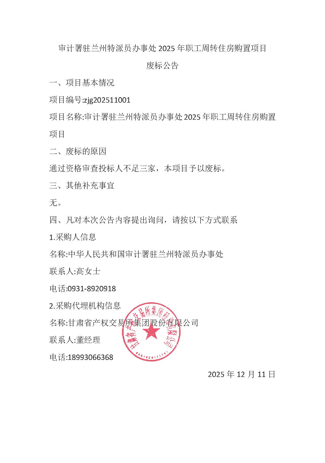 审计署驻兰州特派员办事处2025年职工周转房购置项目废标公告